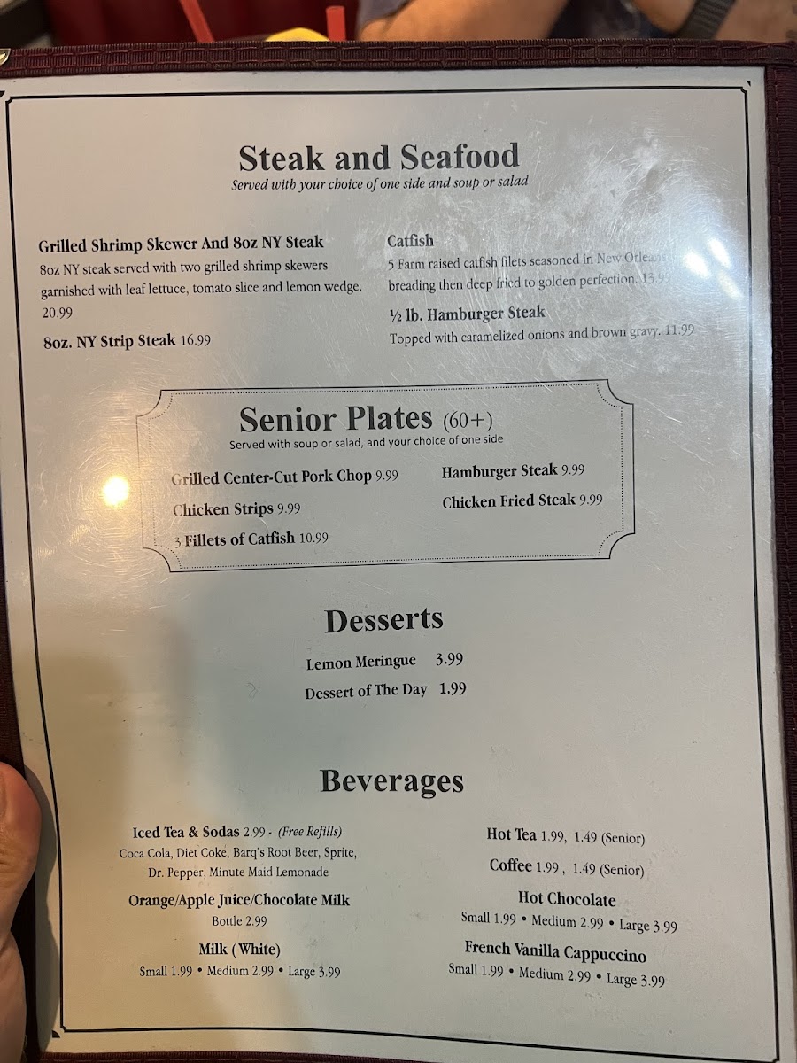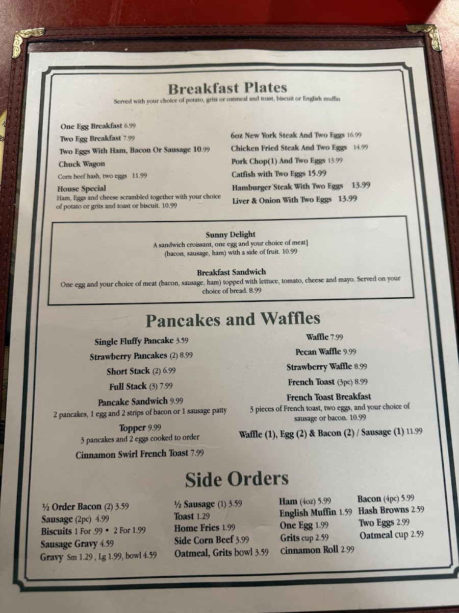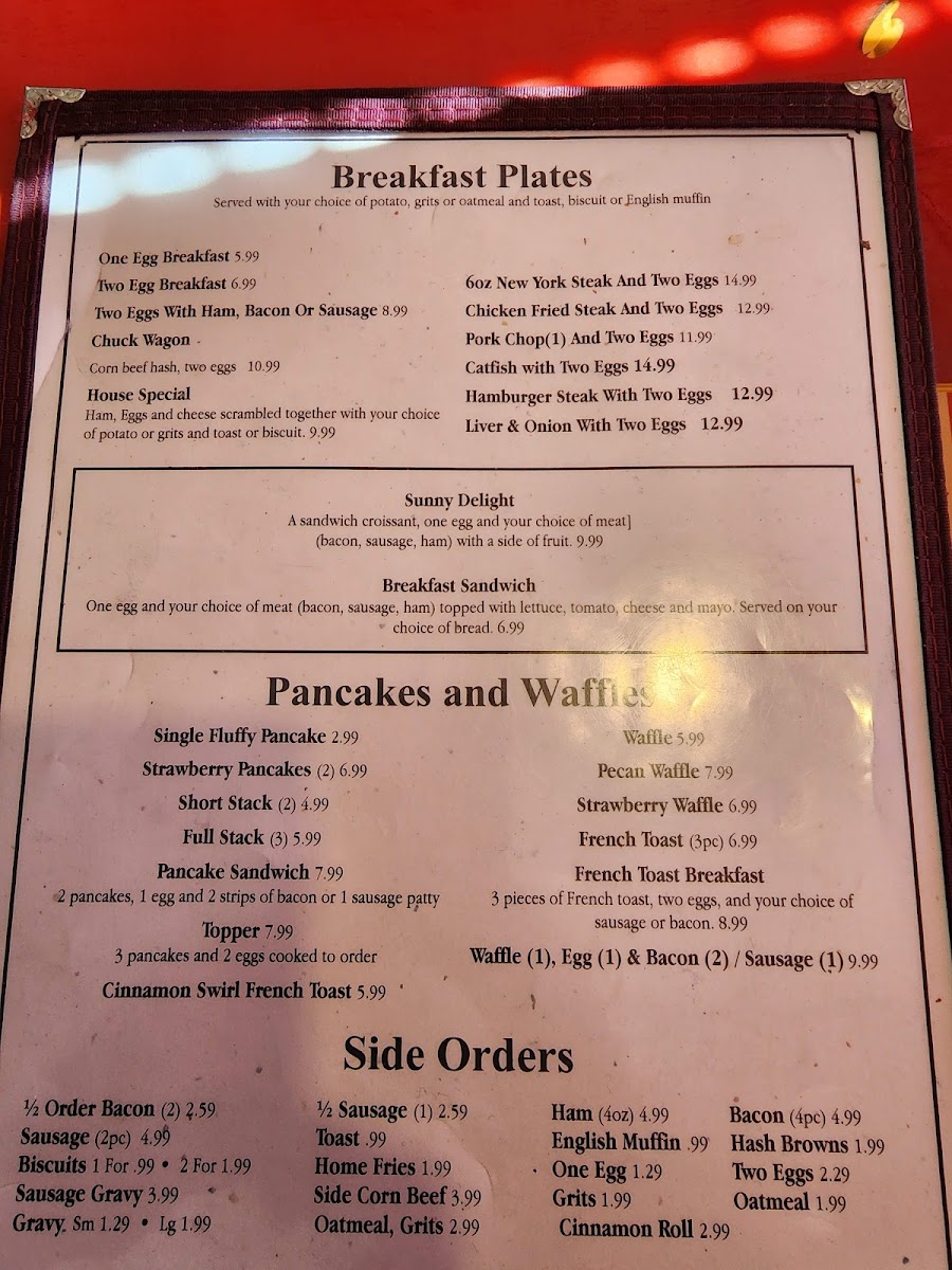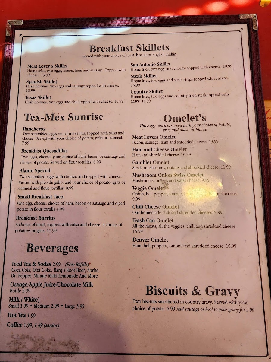 Throughout the day, you can enjoy satisfying skillet meals, like the Country Skillet or San Antonio Skillet, alongside comforting plates such as Chicken Fried Steak with country gravy or a simple Cheeseburger with fries. The menu strikes a nice balance between generous portions and straightforward flavors, matching the warm, laid-back atmosphere of this family restaurant.
